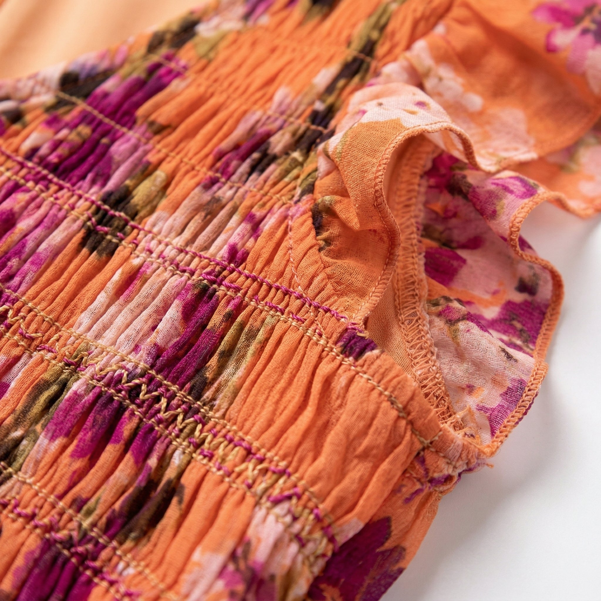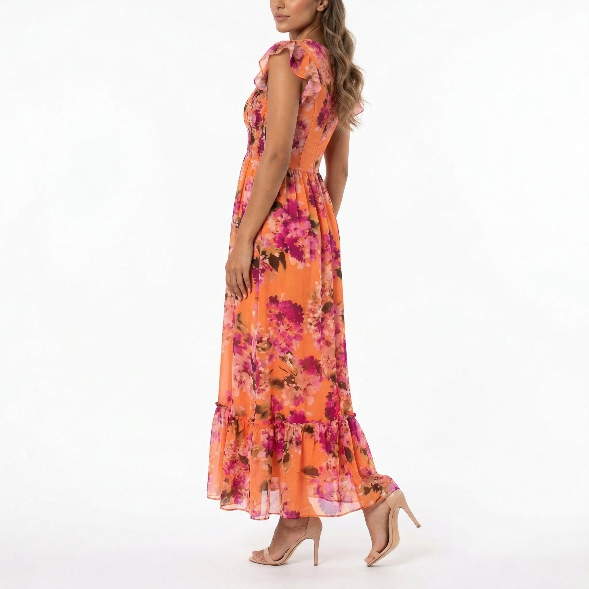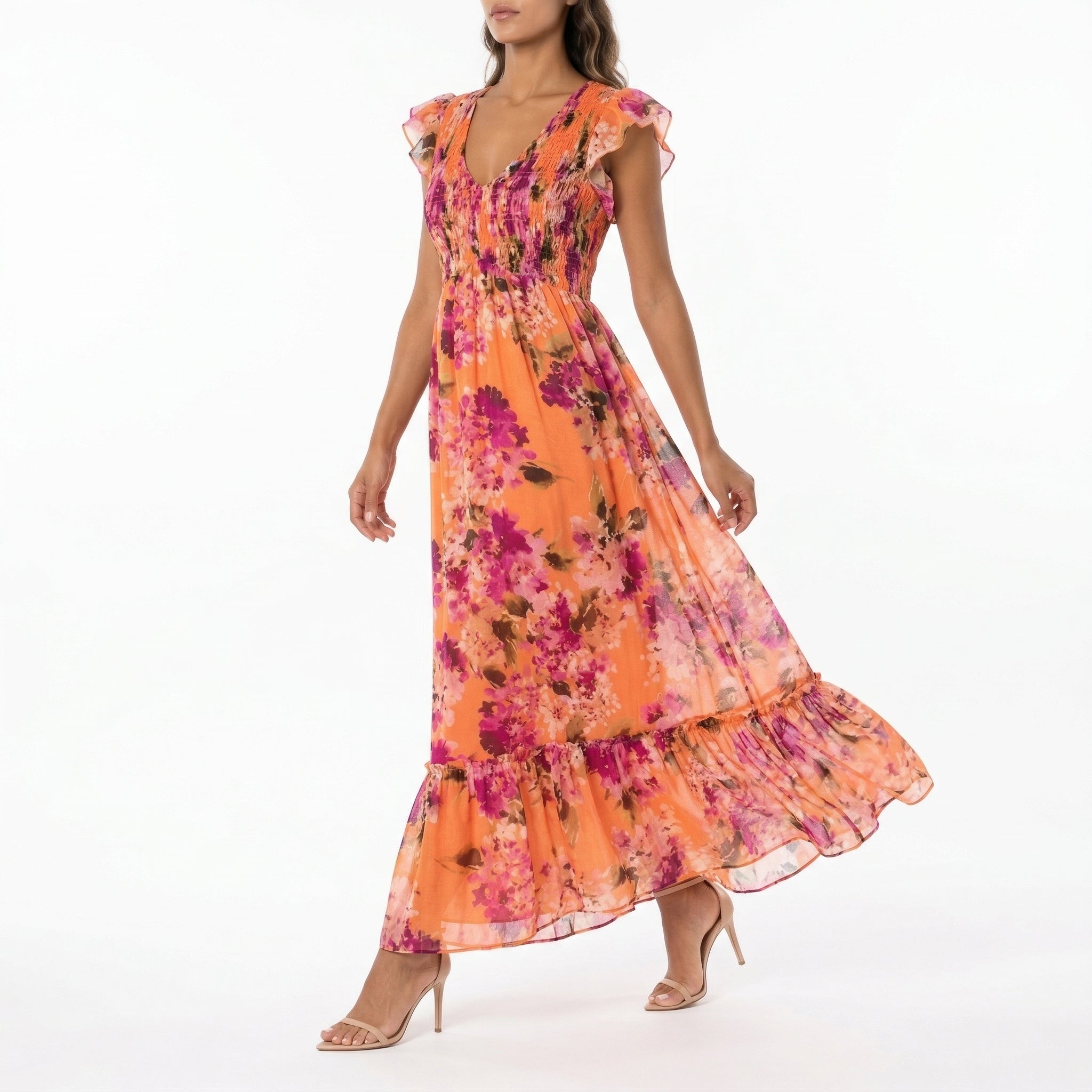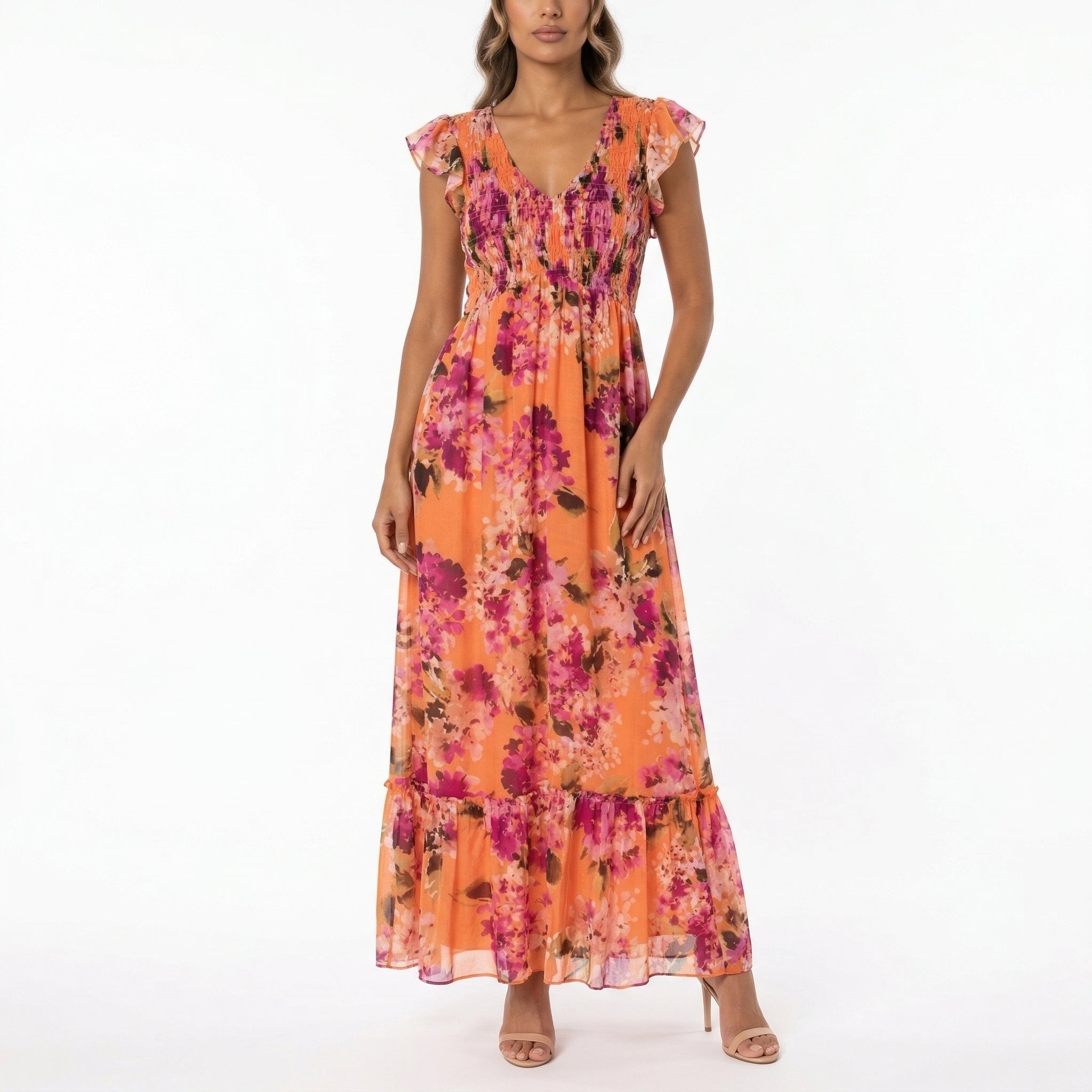 PEACH FLORAL MAXI DRESS – V-NECK FLUTTER SLEEVE SMOCKED BOHO DRESS