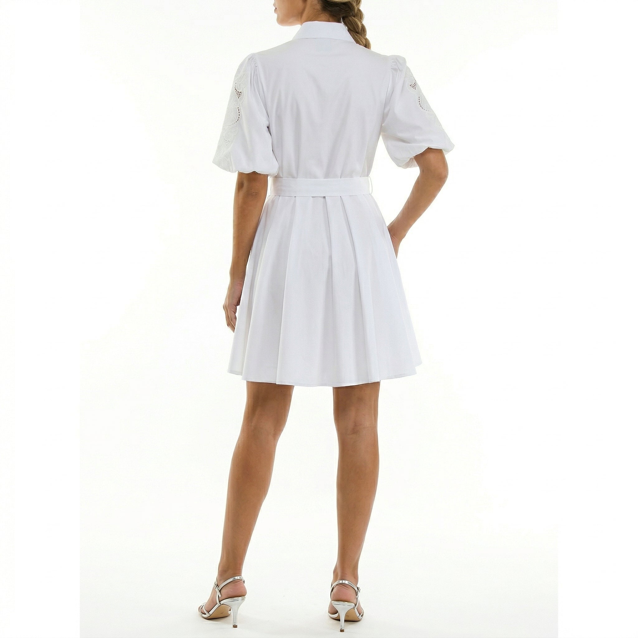 WHITE PUFF SLEEVE BUTTON-DOWN SHIRT DRESS WITH BELT – WOMEN’S A-LINE SUMMER MIDI DRESS