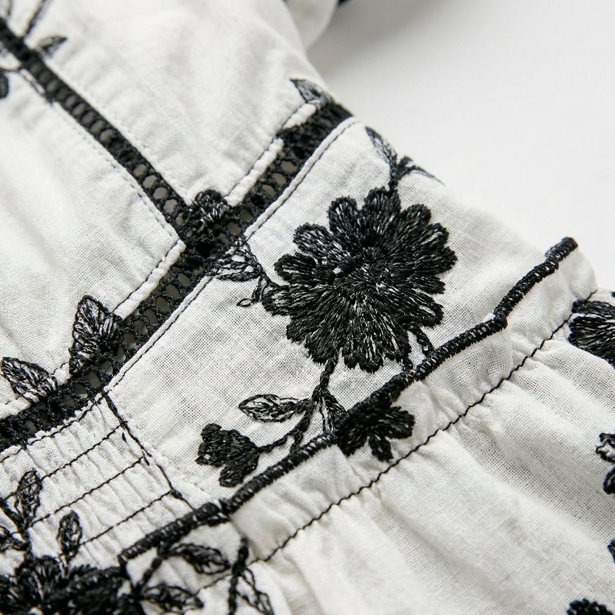 IVORY AND BLACK FLORAL EMBROIDERED MINI DRESS WITH V-NECK AND PUFF SLEEVES
