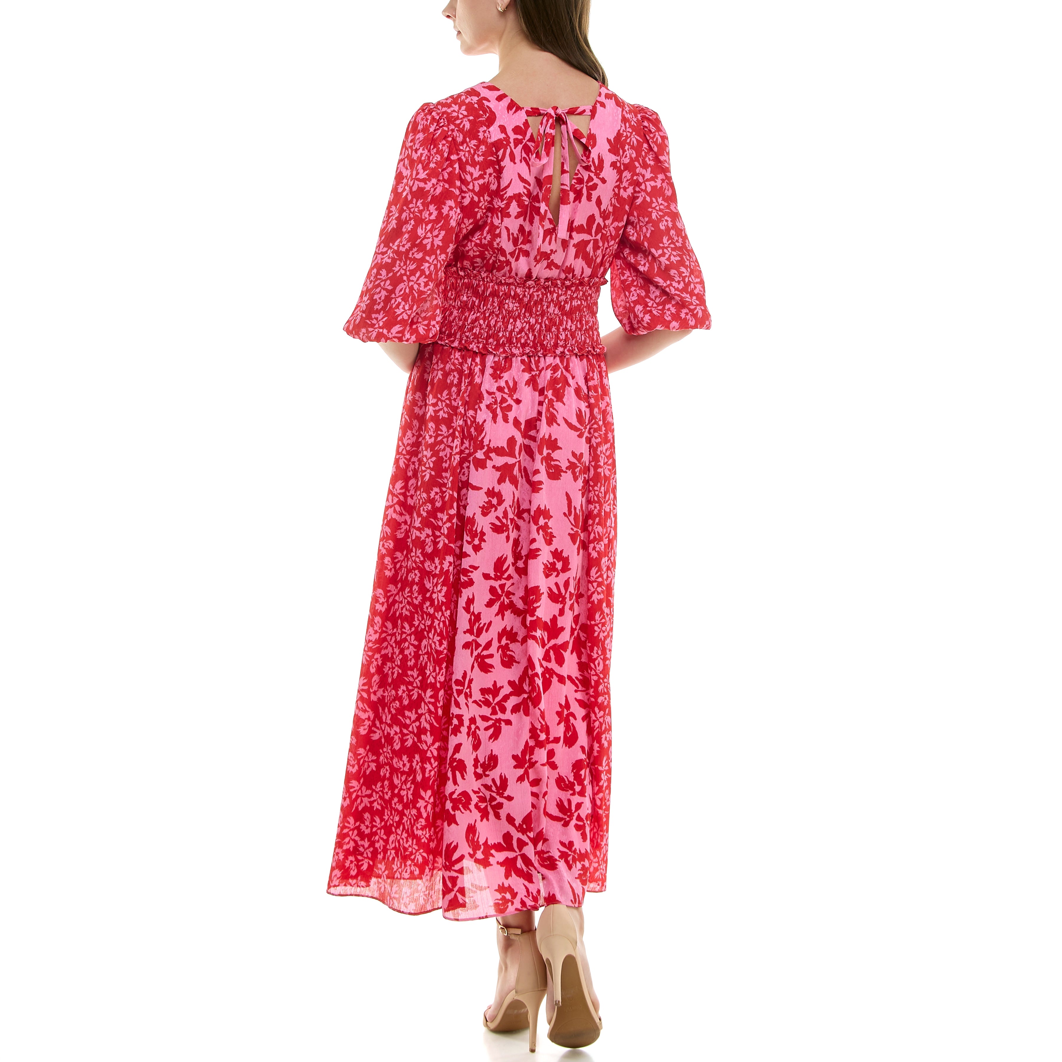 Elbow-length puff sleeve maxi dress with V-neckline, smocked elastic cummerbund waist, and mixed vintage-inspired floral print.
