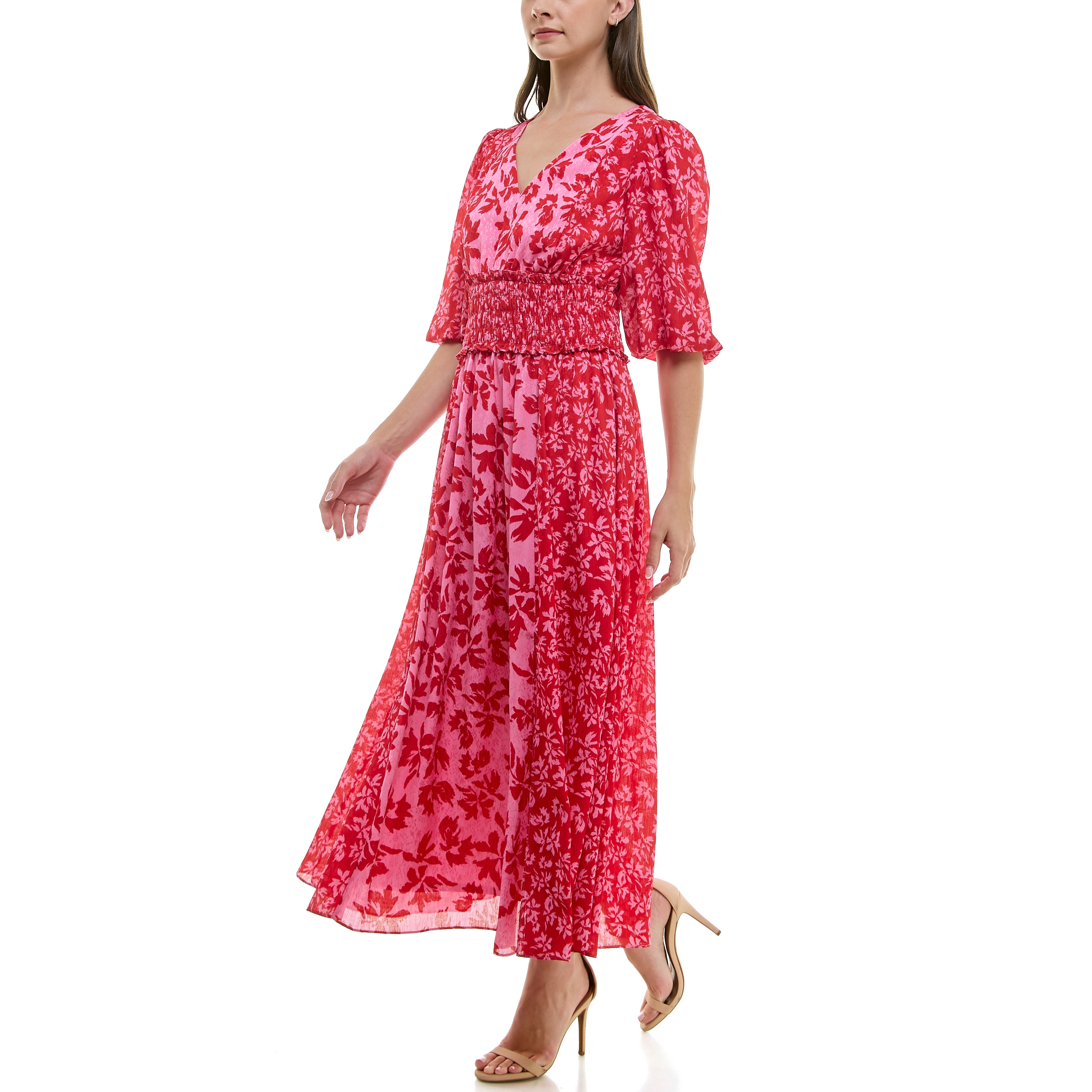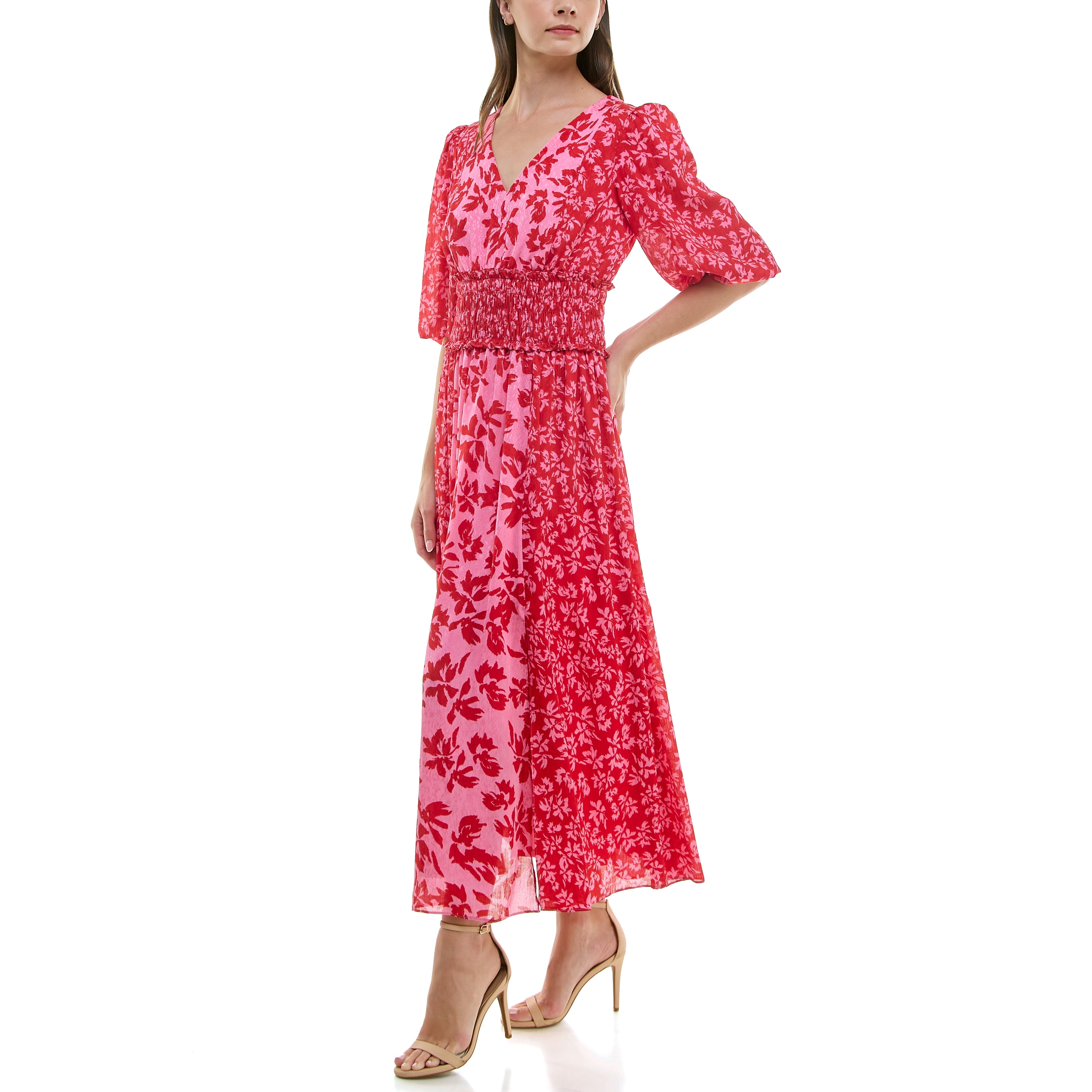 TAYLOR FLORAL MIXED PRINT SMOCKED WAIST MAXI DRESS