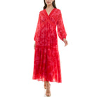 TAYLOR LONG SLEEVE V-NECK TIERED FLORAL PRINT MISSY MAXI DRESS WITH POCKETS