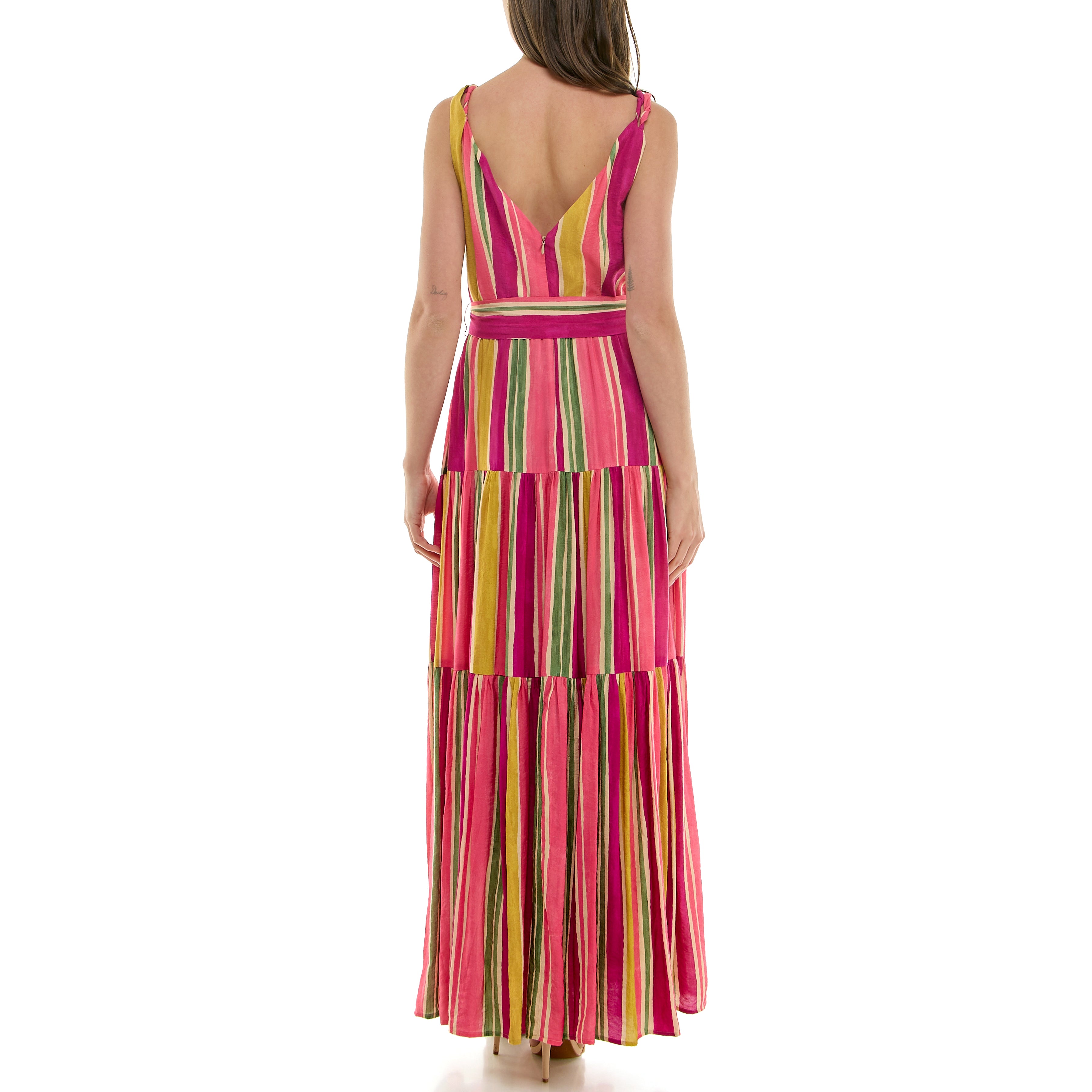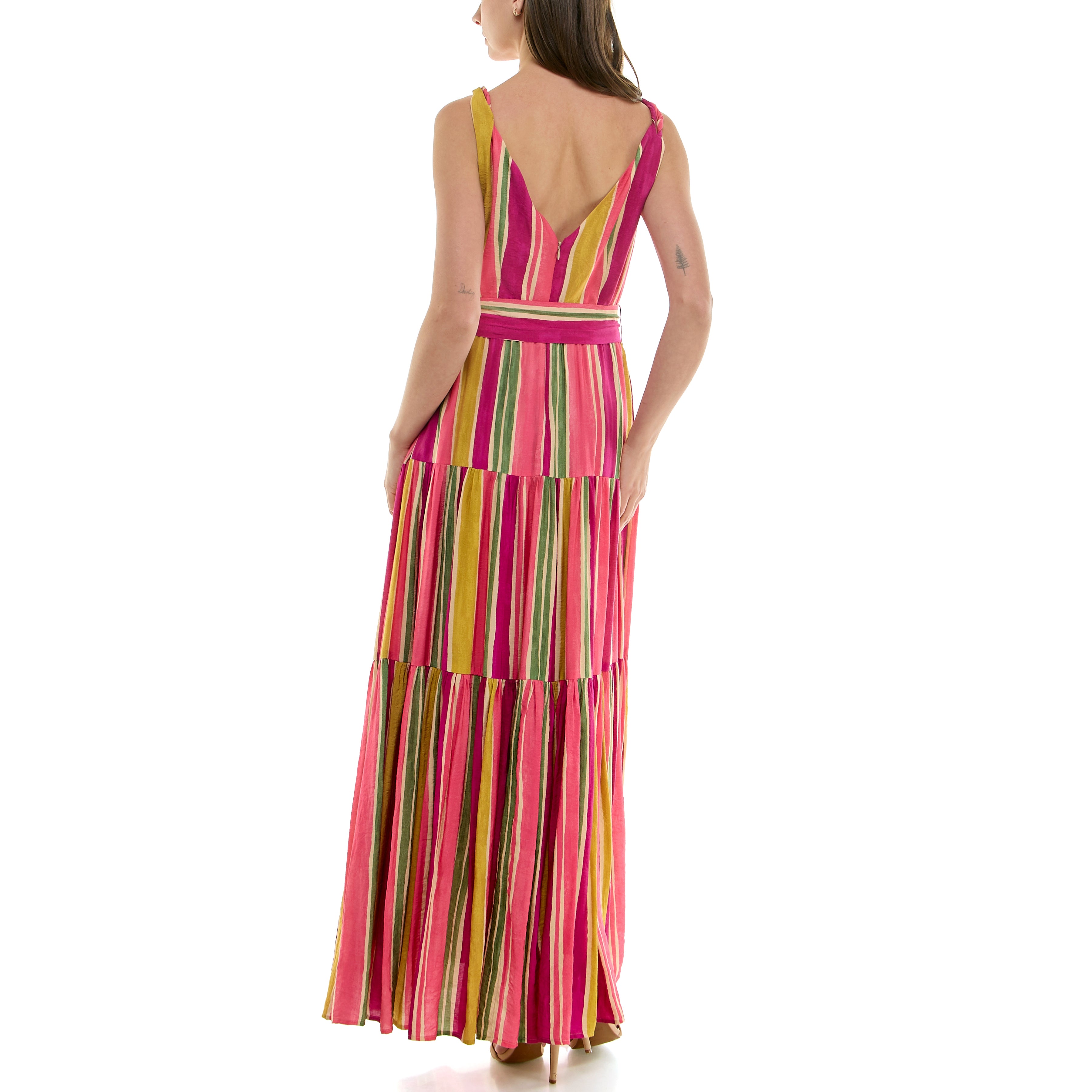 Lined sleeveless three tier tank maxi dress with double V-neckline, alternating multicolored vertical stripe print, twisted strap detail, self-tie ribbon waist sash, and three tier skirt.
