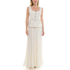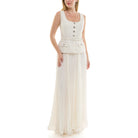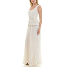 Lined sleeveless maxi dress with square neckline, front button trims, button flap pockets, accordion pleated skirt, and back zip closure.