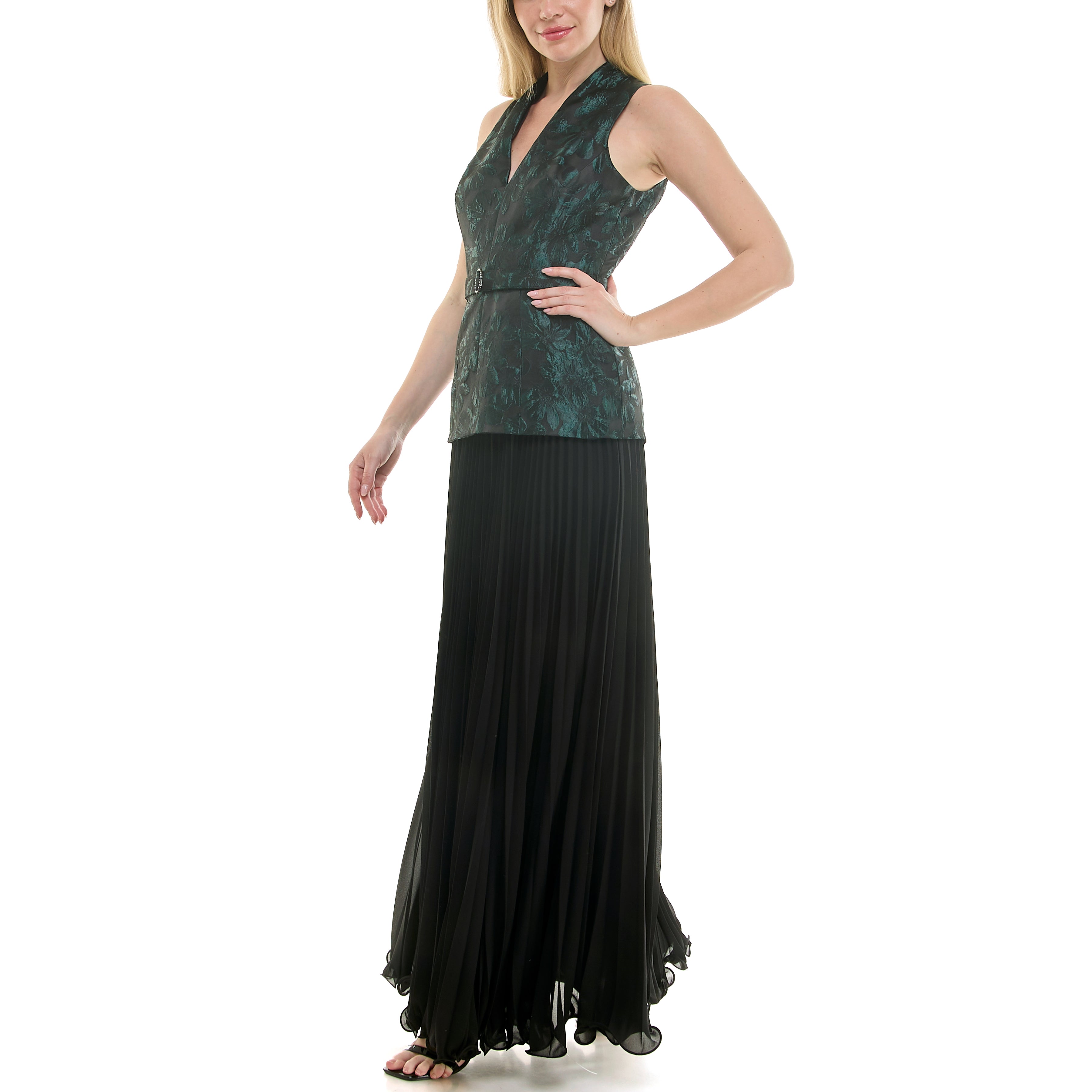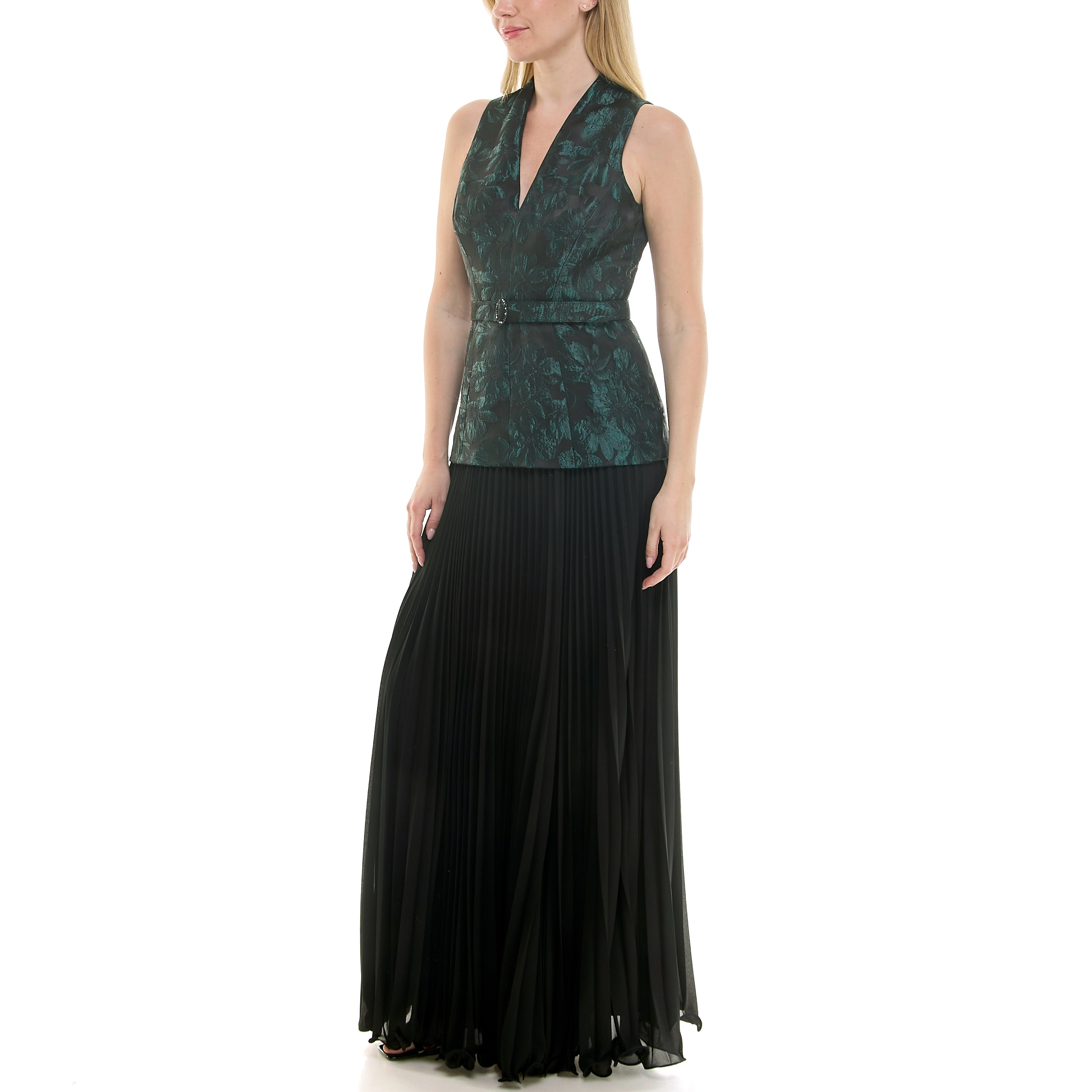 Lined sleeveless floor length gown with split neckline, coordinating belt, floral brocade bodice, accordion pleated chiffon hem skirt, and invisible back zip closure,