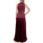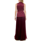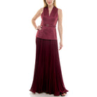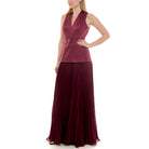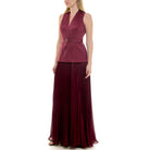 Lined sleeveless floor length gown with split neckline, coordinating belt, satin bodice, accordion pleated chiffon hem skirt, and invisible back zip closure,