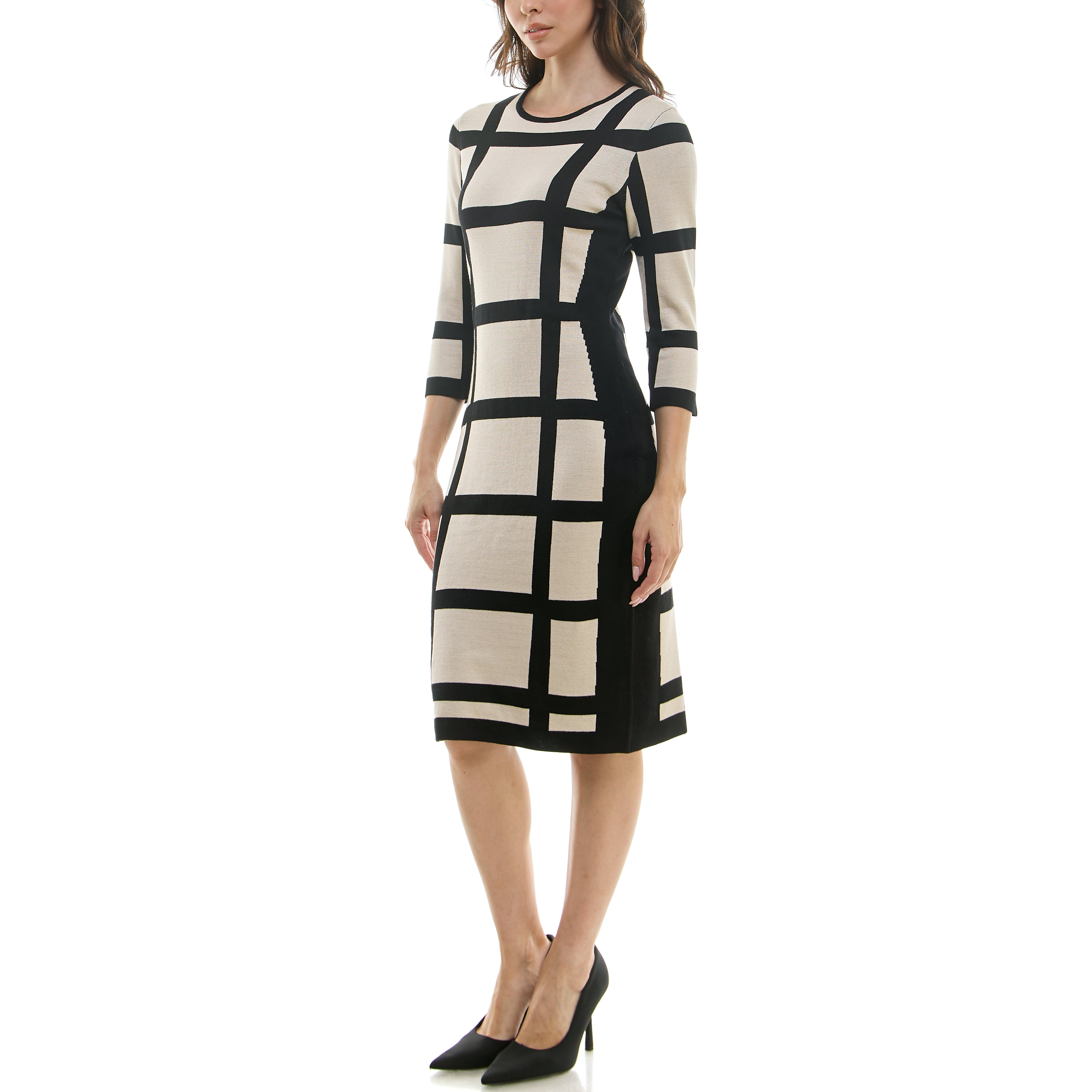 Unlined pullover stretch knit sheath midi dress with jewel neckline, 3/4 sleeves, bold black band window pane plaid pattern, and knee length hem.