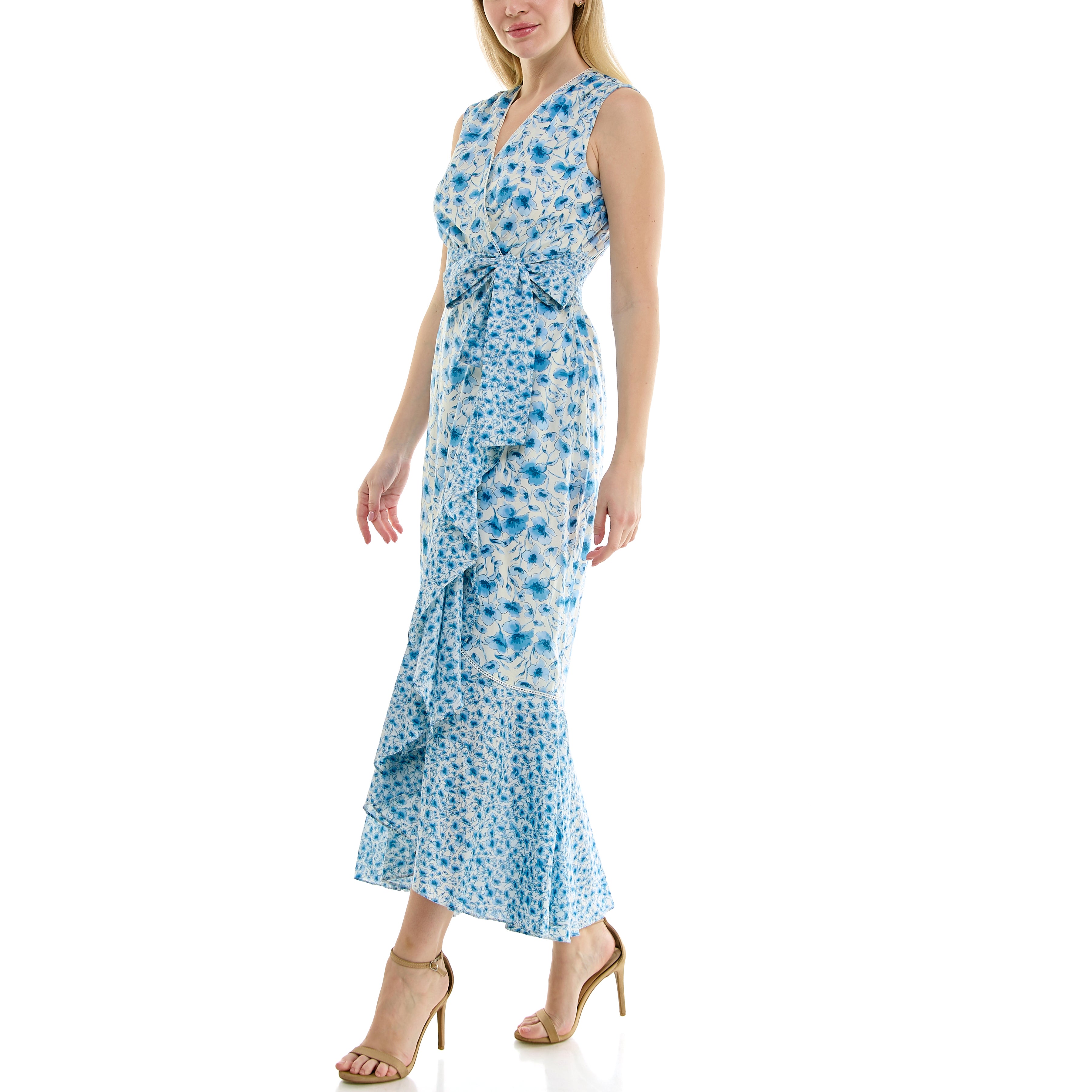 Lined sleeveless wrap maxi dress with contrasting floral pattern, ruffled hem, V-neckline, back zip closure, and self-tie ribbon belt.