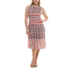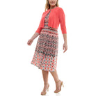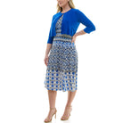 Multi-panel round neckline jacket with single clasp and unlined mixed abstract print midi dress.