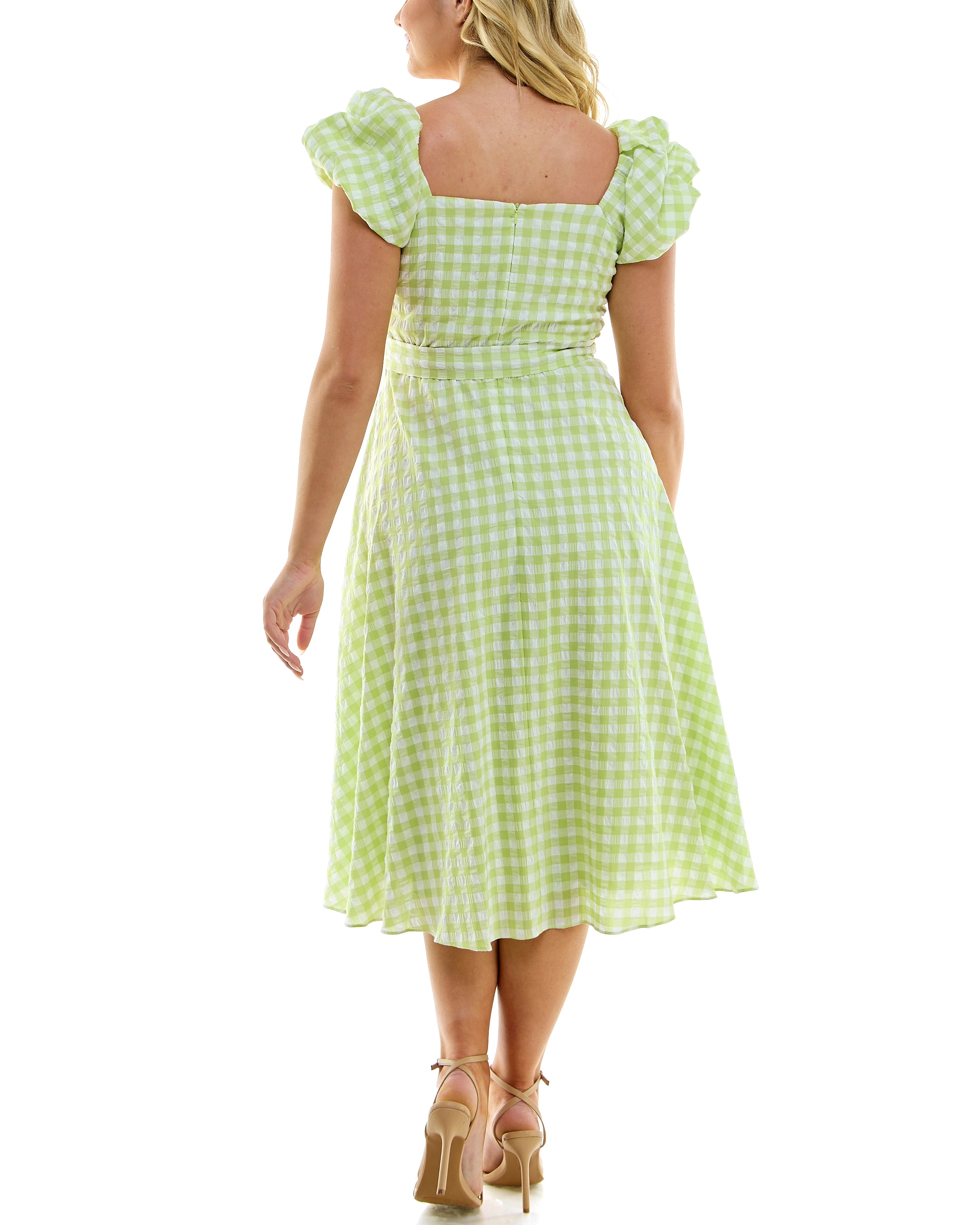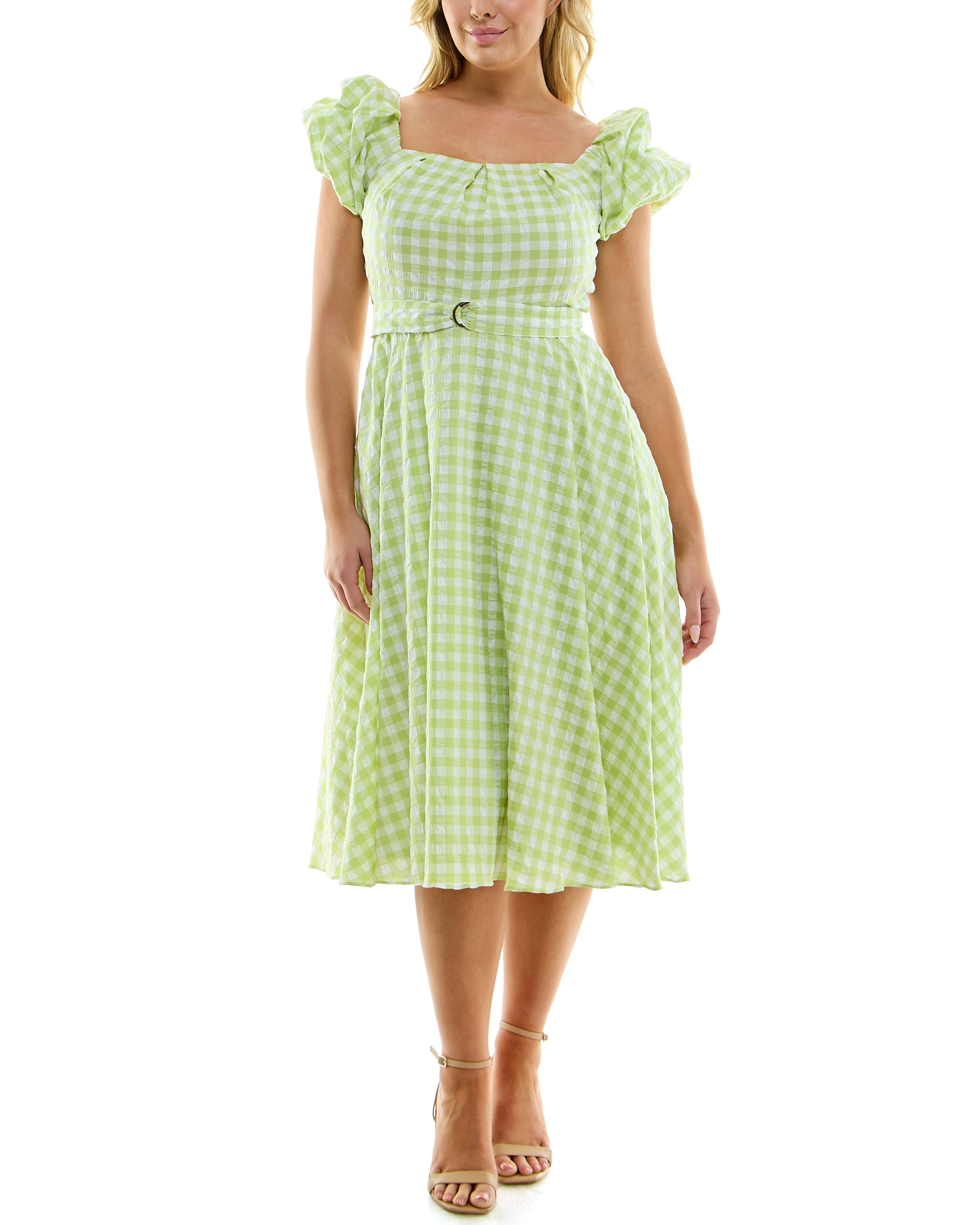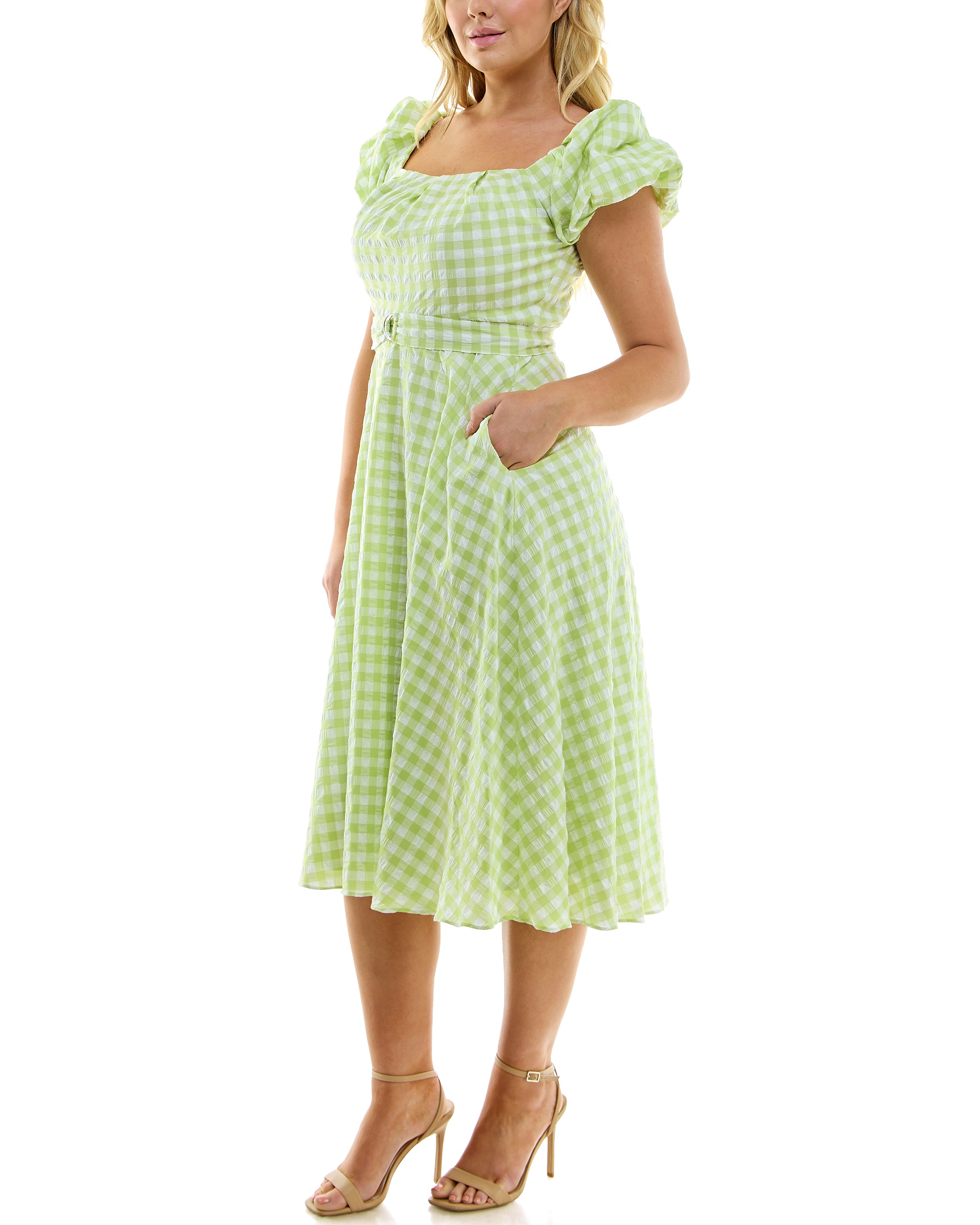 Plus-sized midi dress with pleated square neckline, short ruched puff sleeves, empire waist, ring buckle faux belt, gingham check print, and back zip closure.
