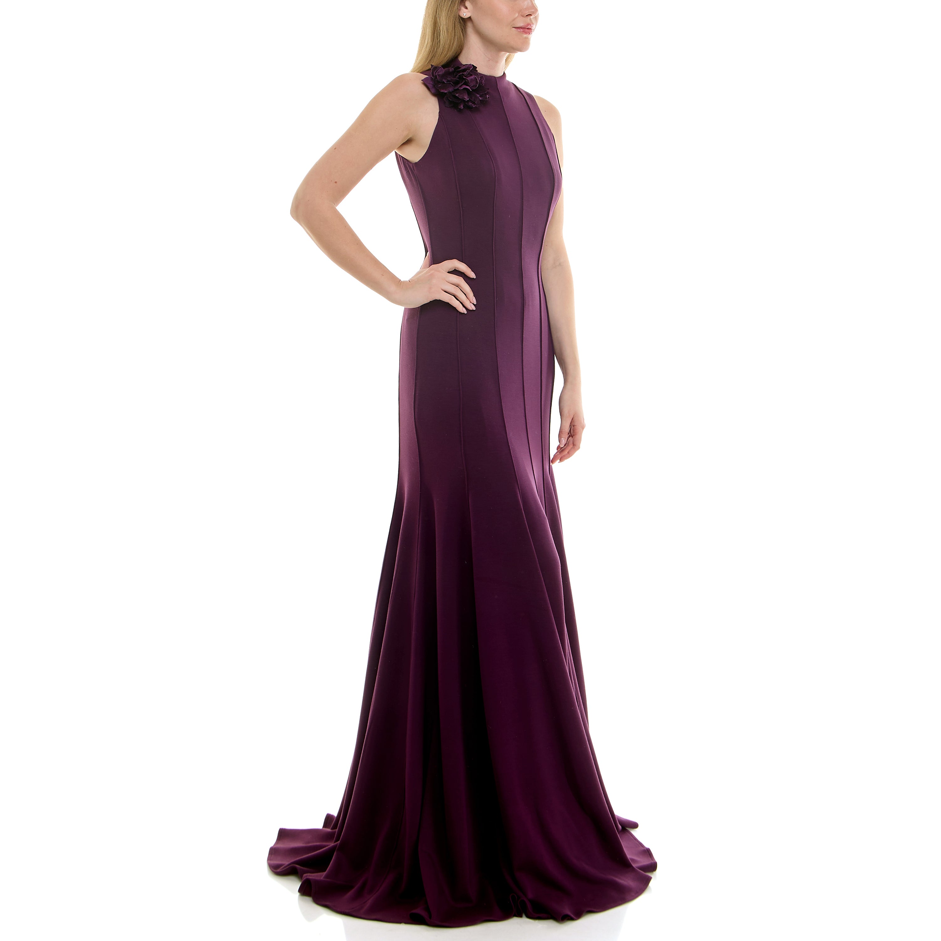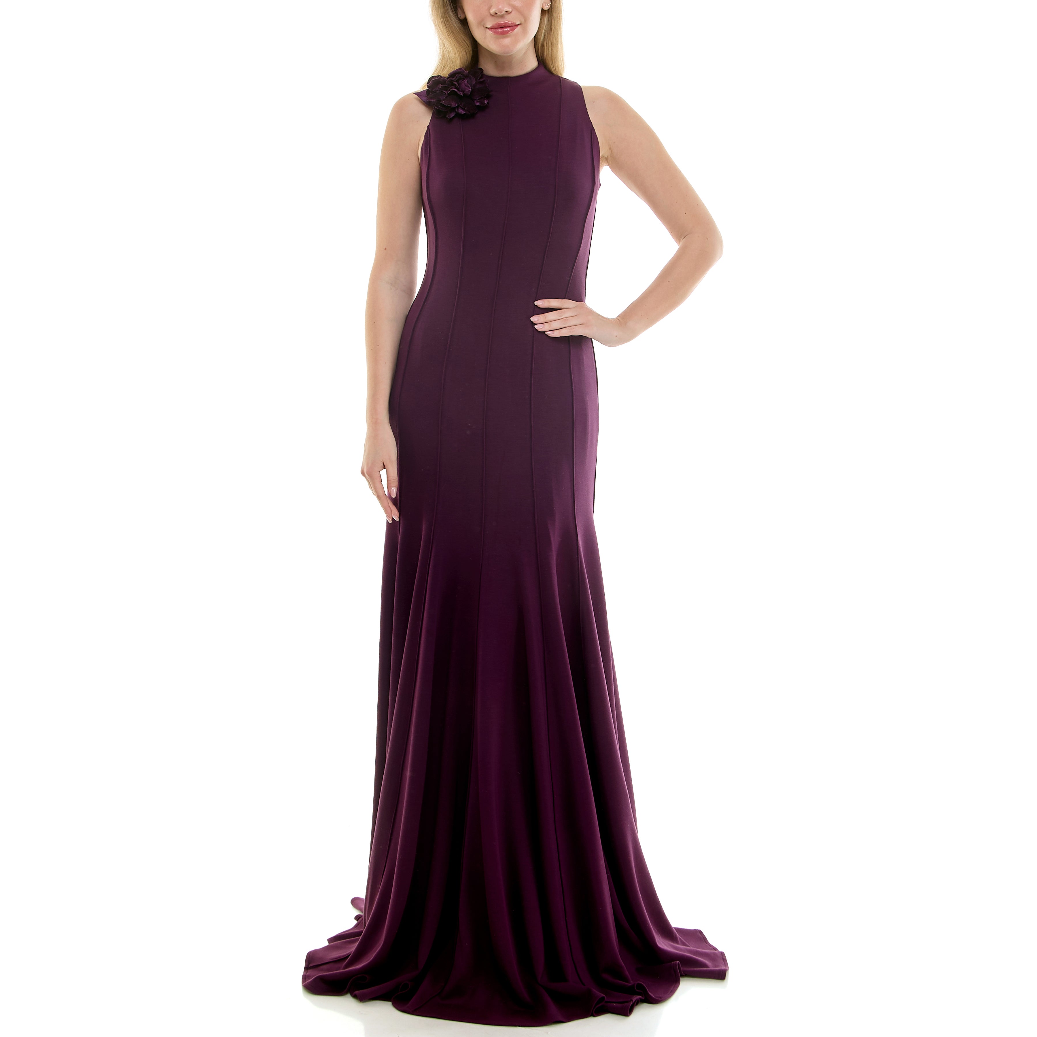Lined sleeveless floor-length evening gown with mock neckline, rose adornment on right shoulder, vertical pleats, and back zip closure.