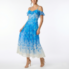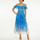 Step into effortless elegance with this stunning blue floral cold shoulder maxi dress, designed to bring grace and movement to every step. Crafted in a lightweight, flowy chiffon-style fabric, this dress features a beautifully fitted bodice that flows into a soft, airy skirt with a delicate ombre fade to ivory at the hem.