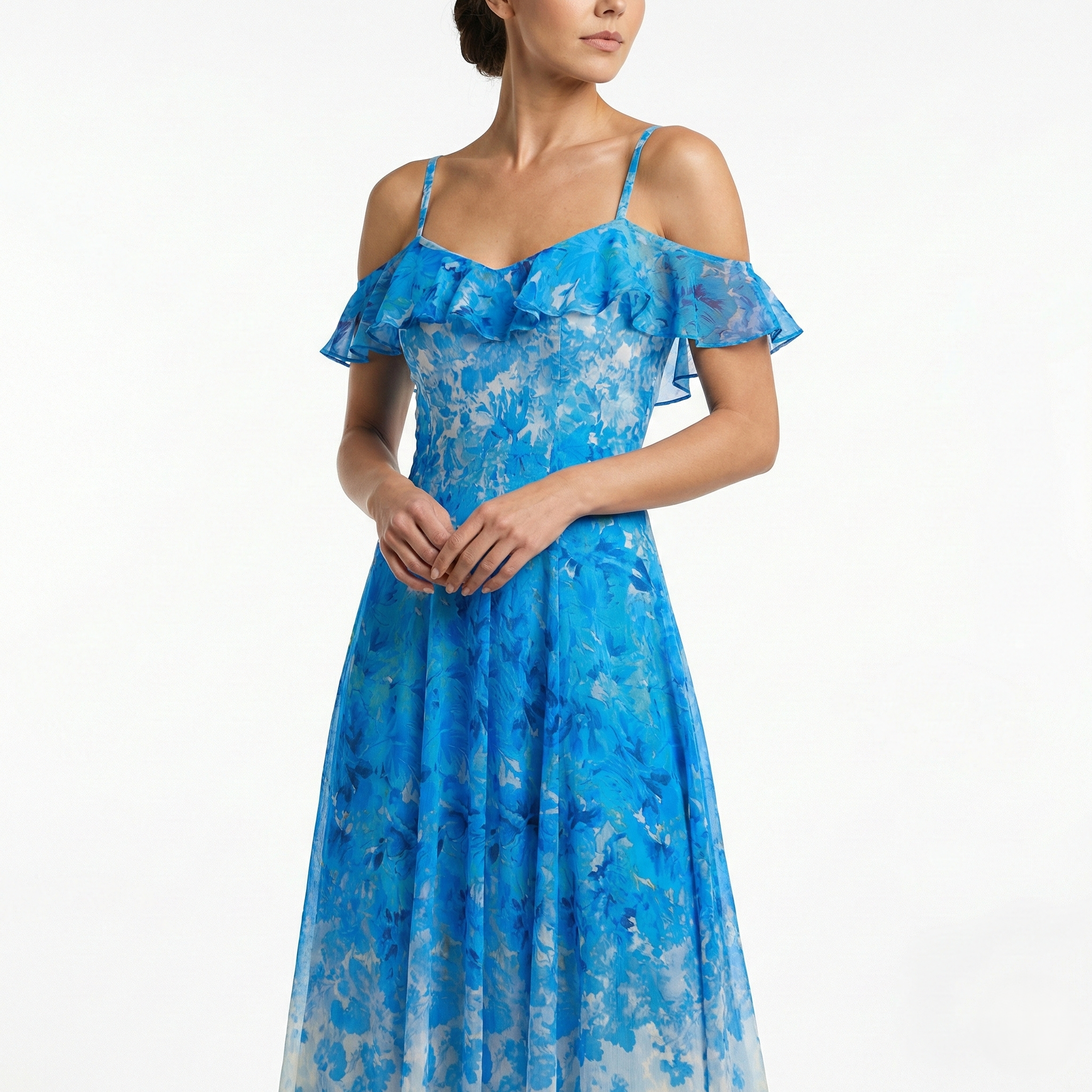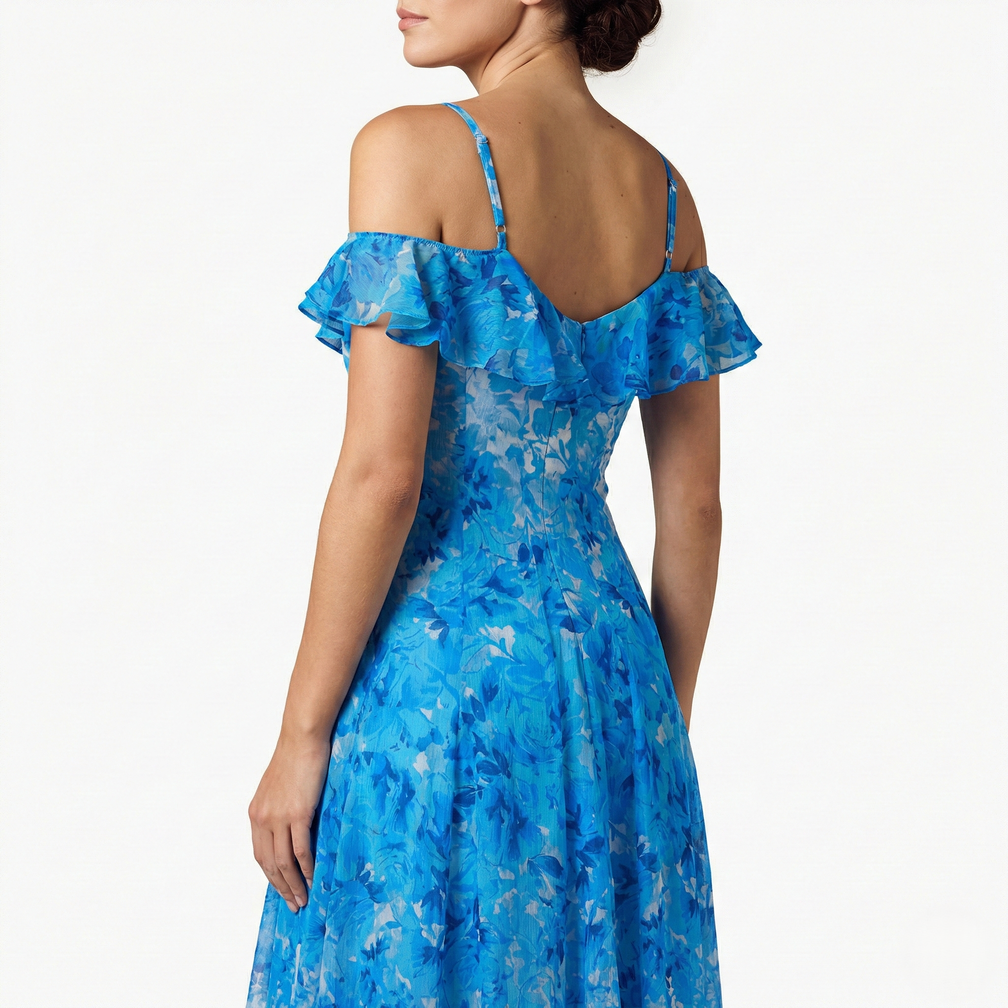 The romantic cold-shoulder neckline is accented with a soft ruffle overlay and slim spaghetti straps, creating a flattering silhouette that highlights the shoulders while offering light support. The all-over blue floral print adds a fresh, feminine charm, making this dress perfect for summer weddings, garden parties, beach vacations, evening events, and resort wear.
