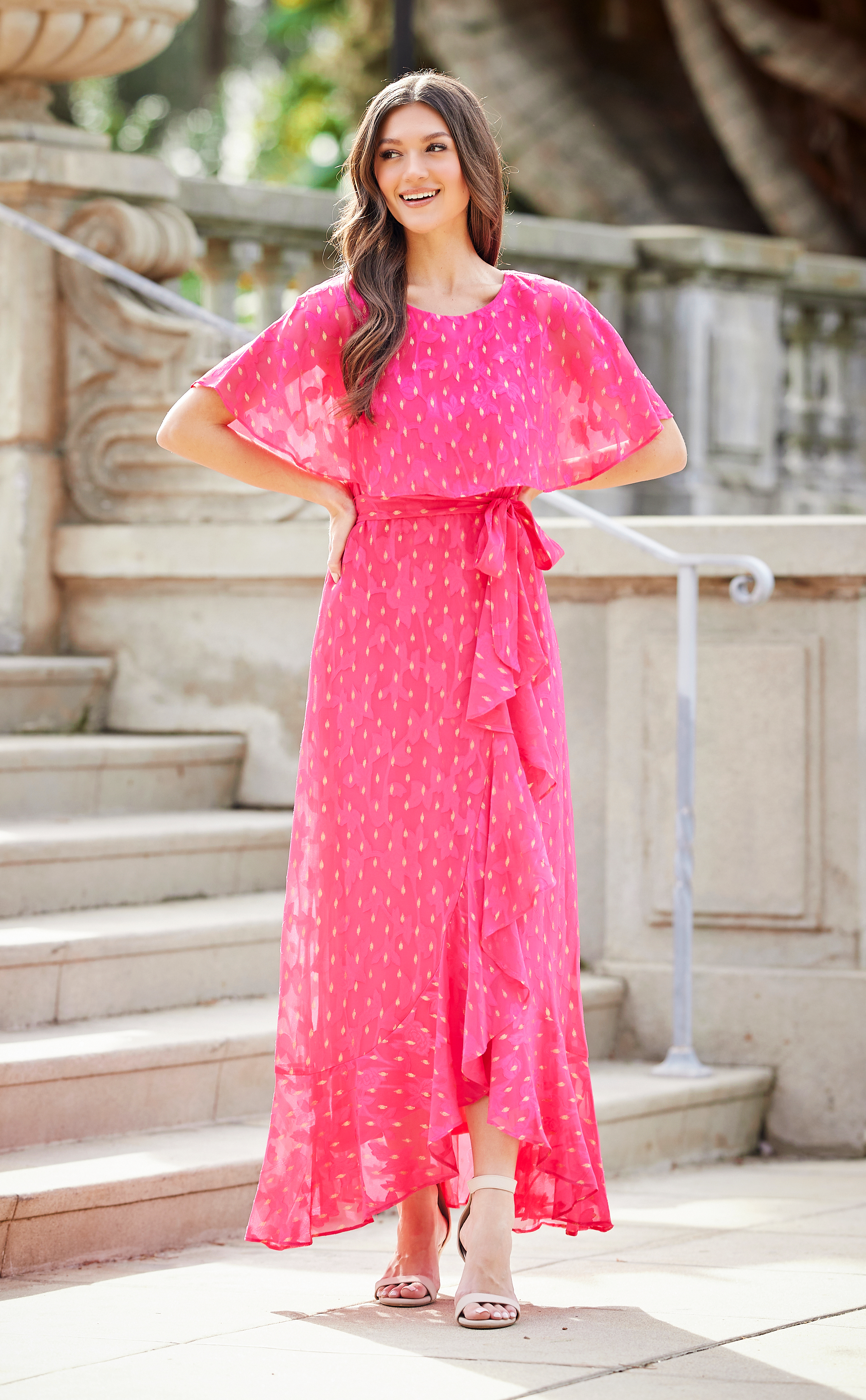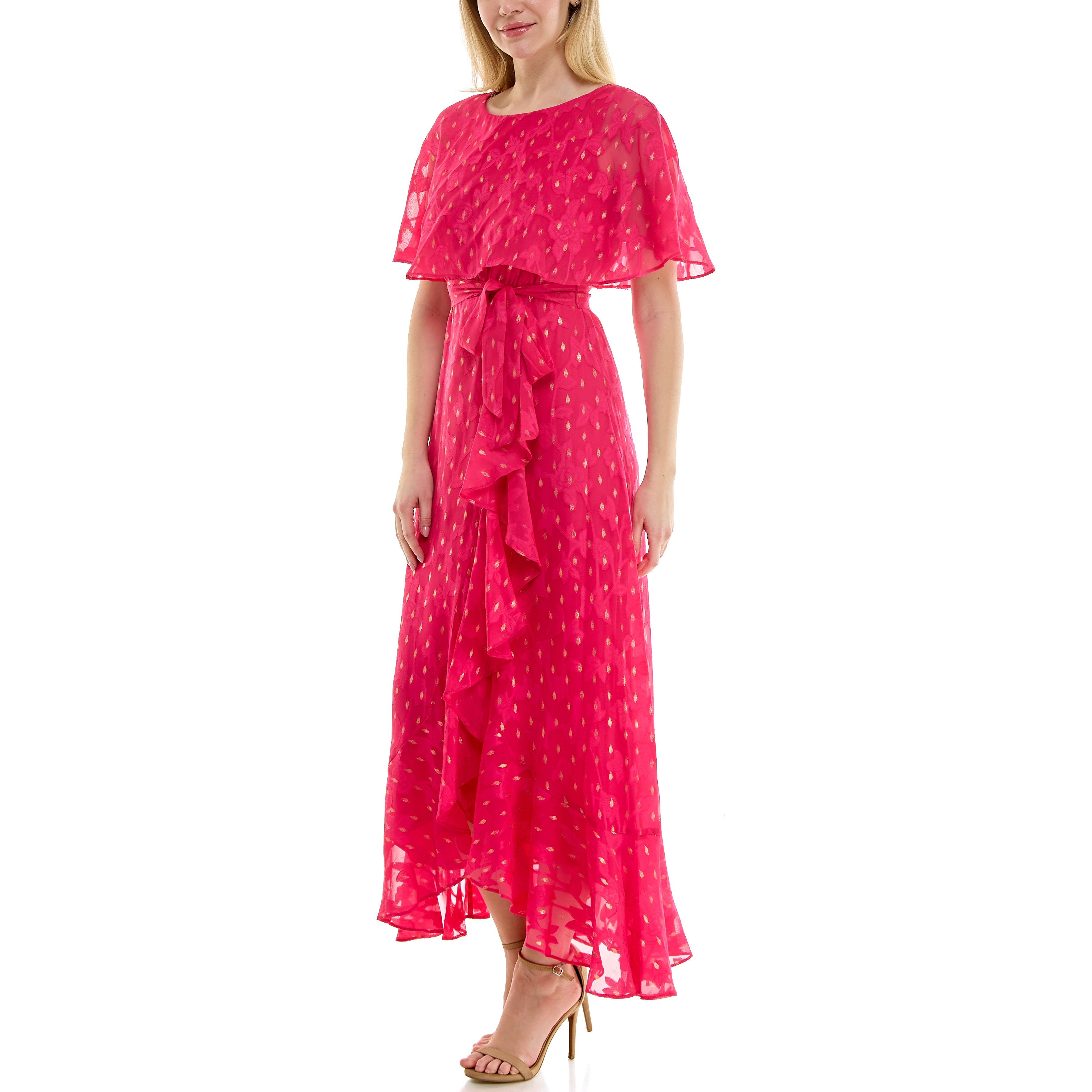 MAISON TARA GOLD FOIL PRINT CHIFFON CAPELET MAXI DRESS