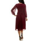 Long sheer balloon-sleeved midi dress with fitted V-neck knot bodice, accordion-pleated skirt, and sparkling mesh overlay.