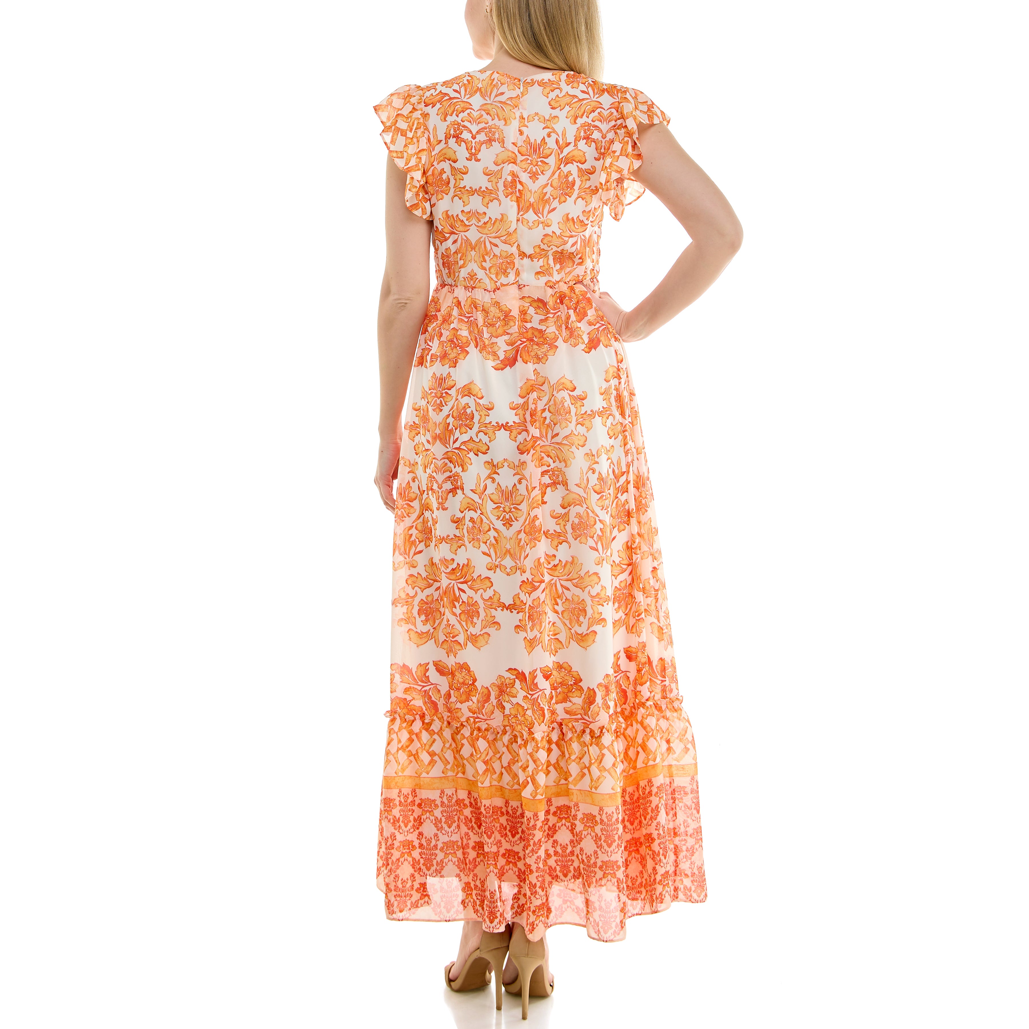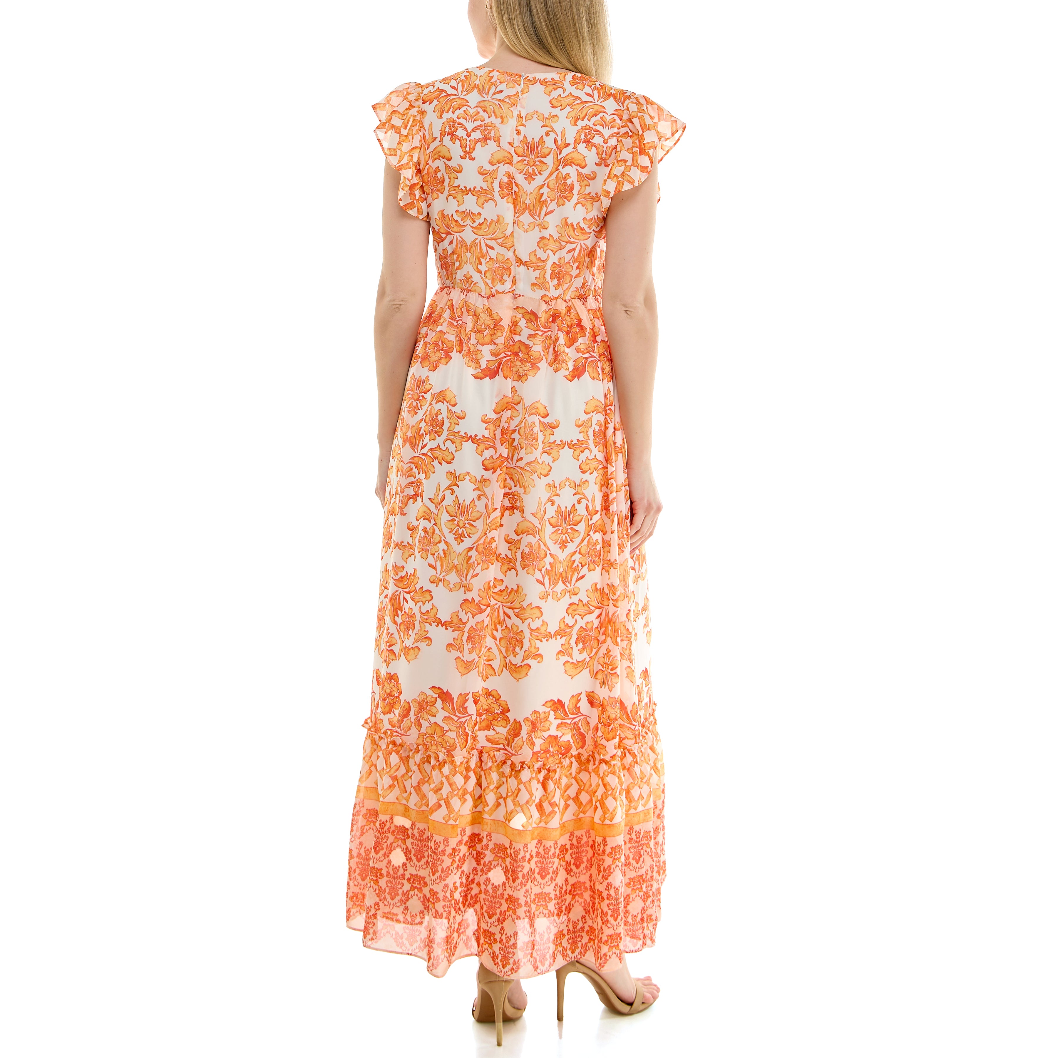 Two-tiered V-neck ruffle-sleeved lined maxi dress with mixed baroque botanical tile print and elastic empire waist.