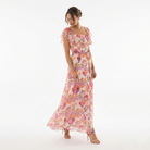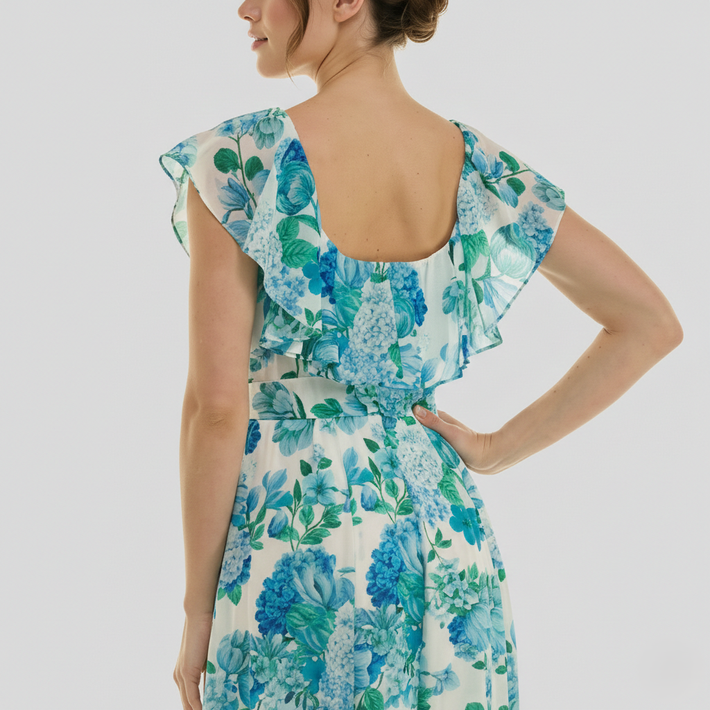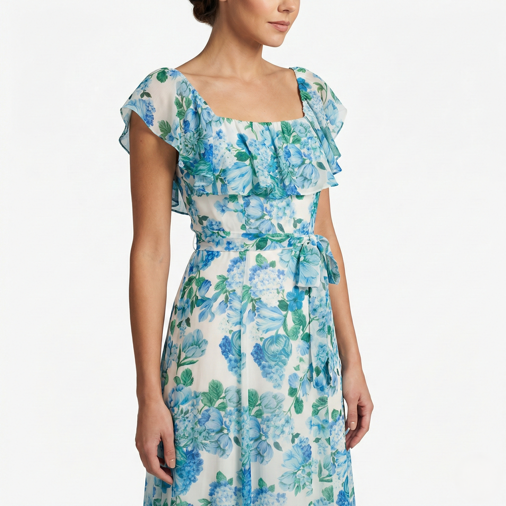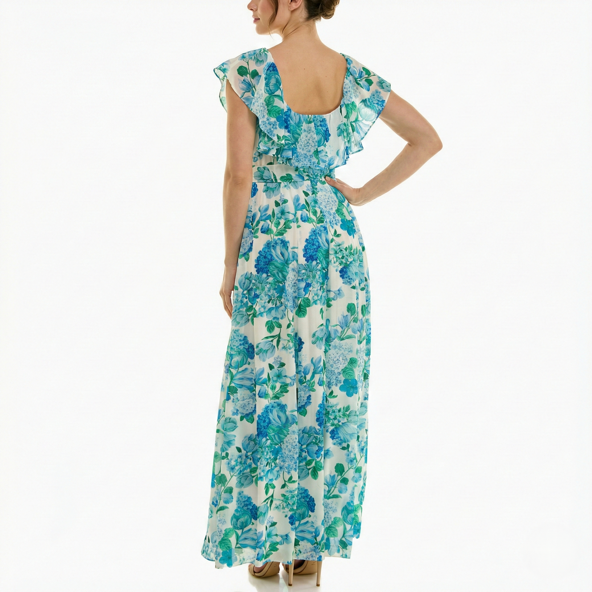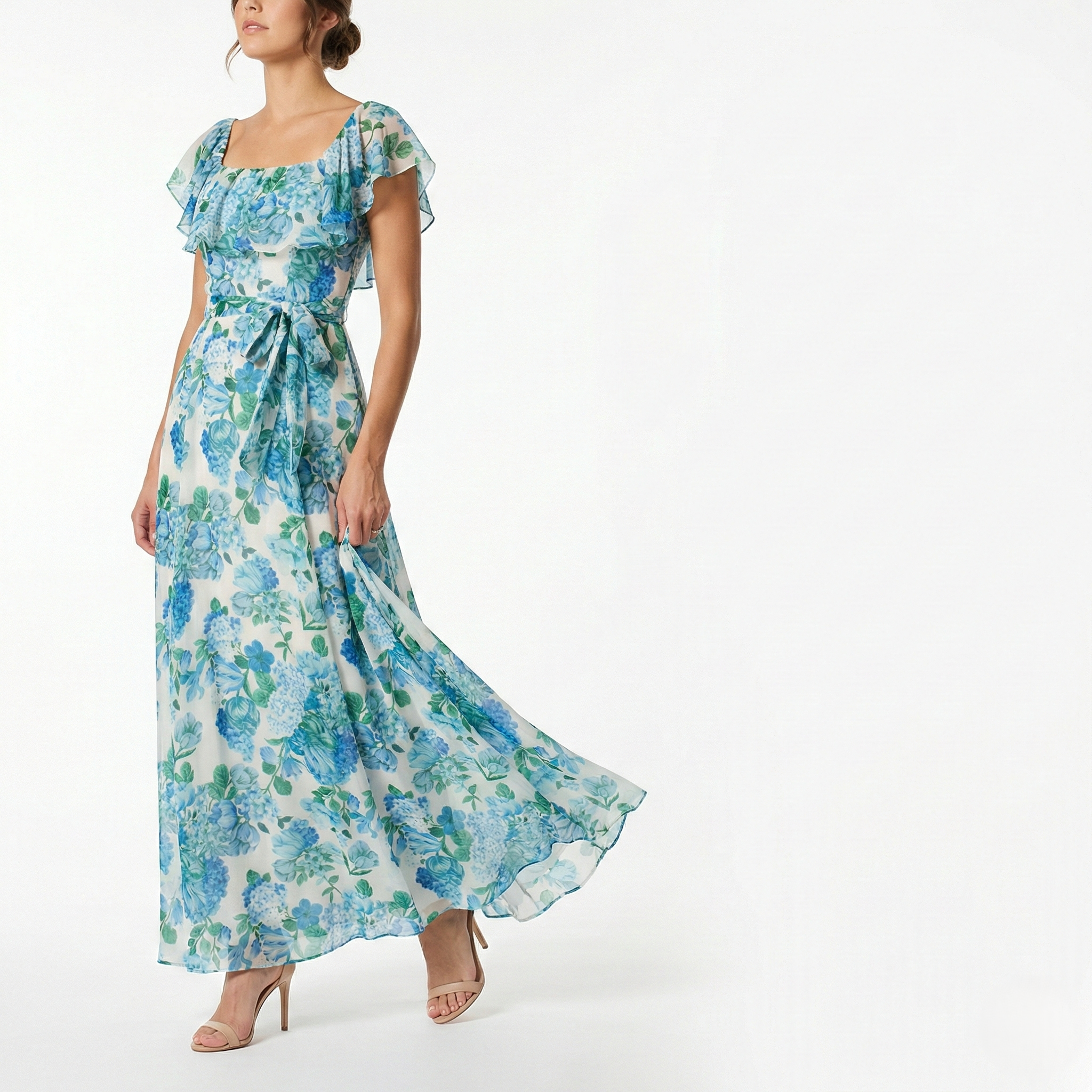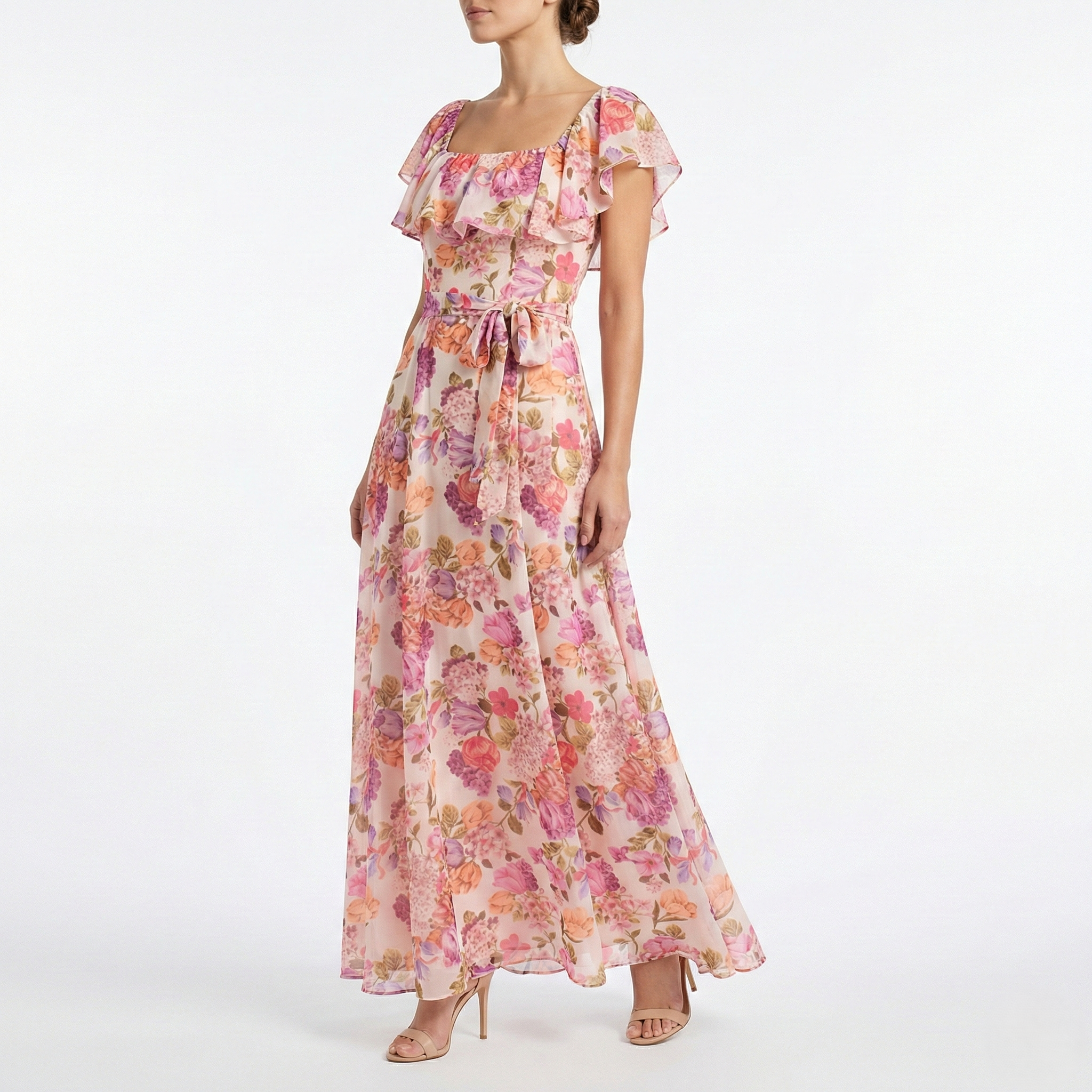 Step into effortless elegance with this women’s floral maxi dress, designed to bring soft romance and flowy movement to your warm-weather wardrobe. Featuring a delicate all-over floral print, this long dress showcases flutter sleeves, a flattering ruffled bodice, and a feminine square neckline that beautifully frames the shoulders and collarbone.